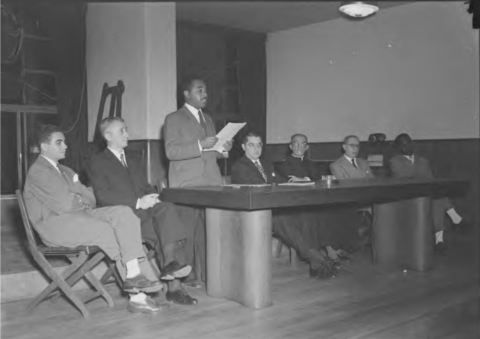 Abdias do Nascimento discursando na sessão de instalação do I Congresso do Negro Brasileiro no salão da Associação Brasileira de Imprensa (ABI). Fonte: Osvaldo Costa/ Agência Nacional. 1950. [Arquivo Nacional].